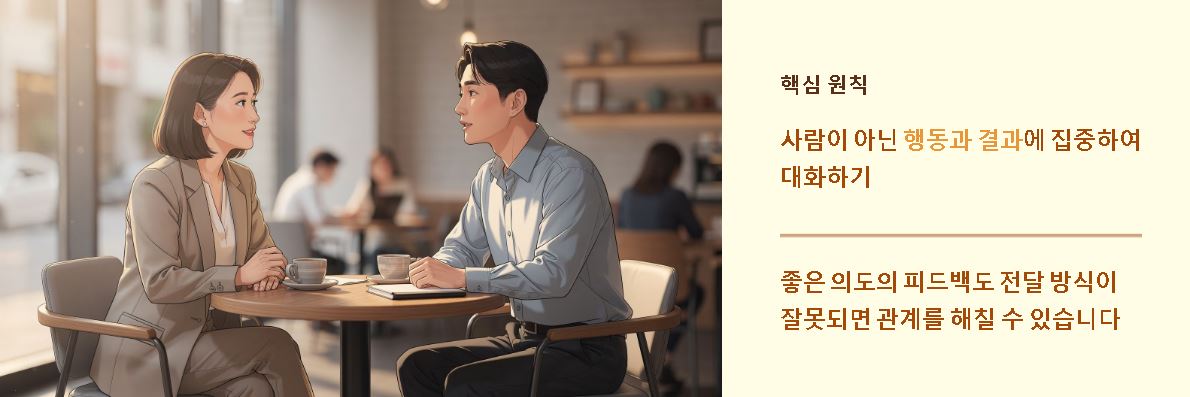 - 샌드위치 기법: 칭찬 사이에 개선점을 넣어 전달함으로써 거부감을 줄입니다.