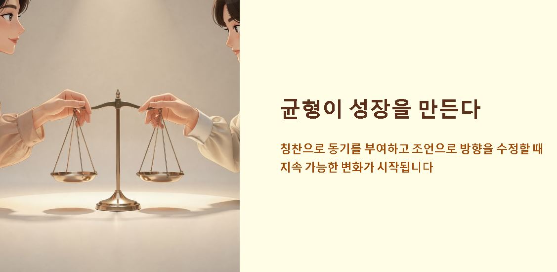많은 분이 이 과정을 부정적인 비판으로 오해하곤 합니다. 하지만 피드백은 잘한 점을 강화하는 긍정적 측면과 잘못된 점을 바로잡는 수정적 측면이 공존하는데요. 칭찬을 통해 동기를 부여하고 조언을 통해 방향을 수정하는 것이 균형 있게 이루어질 때 성장은 극대화됩니다. 이는 건강한 발전을 위한 필수 요소입니다.