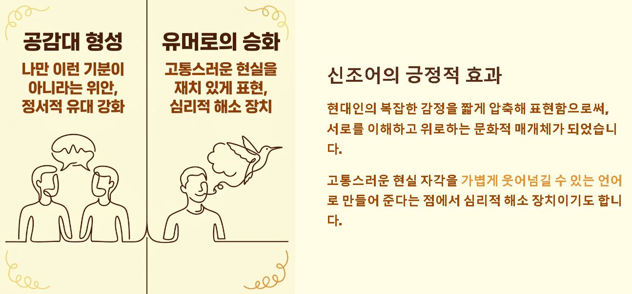 - 언어의 대중화: 방송 매체와 SNS를 통해 널리 퍼지면서 자신의 감정 상태를 짧고 명확하게 전달하는 효율적인 소통 도구가 되었습니다.
