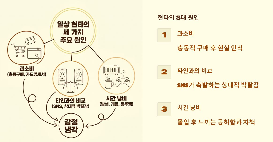 요약: 일상의 현타는 주로 과소비, 타인과의 비교, 시간 낭비 등의 상황에서 발생하며 감정의 급격한 냉각기를 동반합니다.