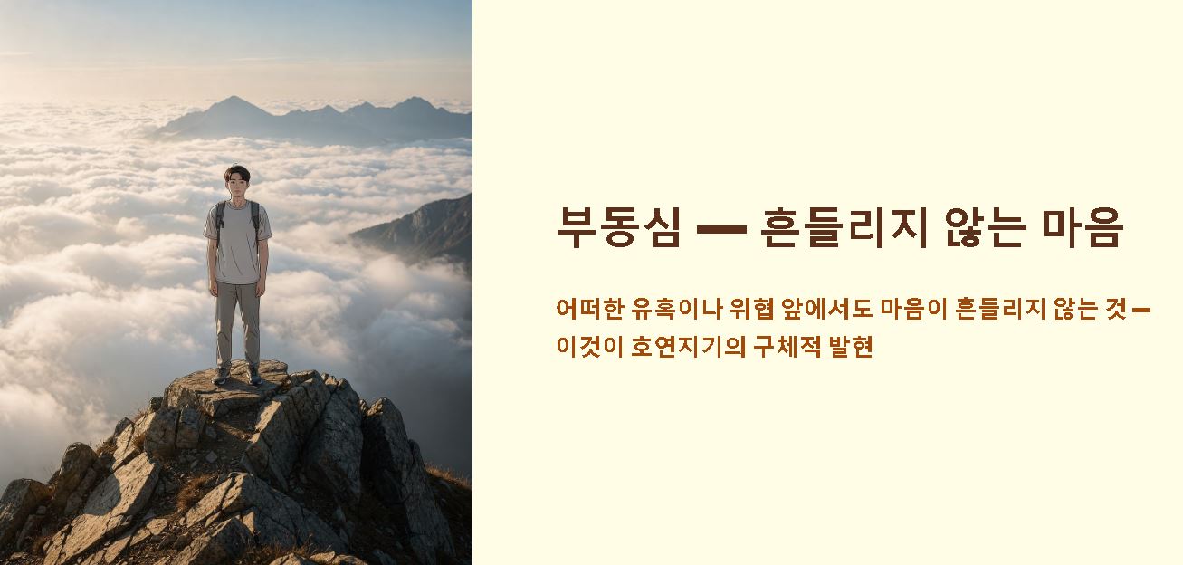 요약: 호연지기는 외부의 풍파에도 굴하지 않는 단단한 자존감과 넓은 도량을 갖춘 인격체의 상징입니다.