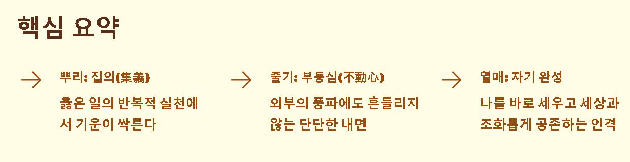 - 집의(集義): 일상 속에서 옳은 일을 꾸준히 쌓아 올릴 때 내면의 기운이 비로소 싹을 틔우기 시작합니다.