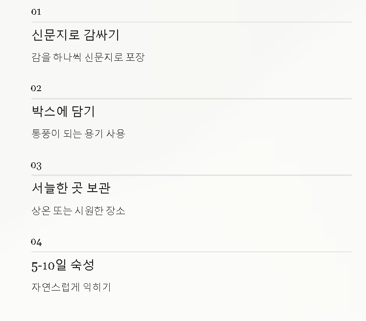 가장 간단한 방법은 감을 신문지로 감싸 서늘한 곳에 두는 방식입니다. 감을 하나씩 신문지로 감싸면 수분이 균일하게 유지되고 외부 충격을 줄일 수 있습니다. 이후 박스나 통에 넣어 상온 또는 서늘한 곳에서 5~10일 정도 숙성시키면 자연스럽게 홍시가 됩니다.