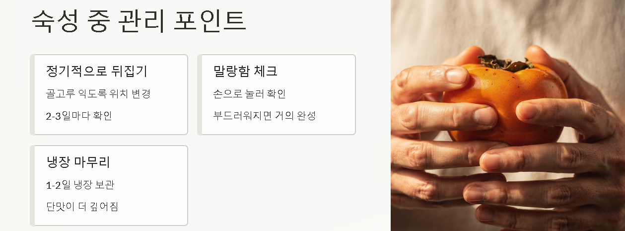 숙성 중에는 감을 뒤집어가며 골고루 익도록 하는 것이 좋습니다. 만졌을 때 말랑해지기 시작하면 거의 완성 단계이며, 냉장고에서 1~2일 더 두면 단맛이 더 깊어집니다.