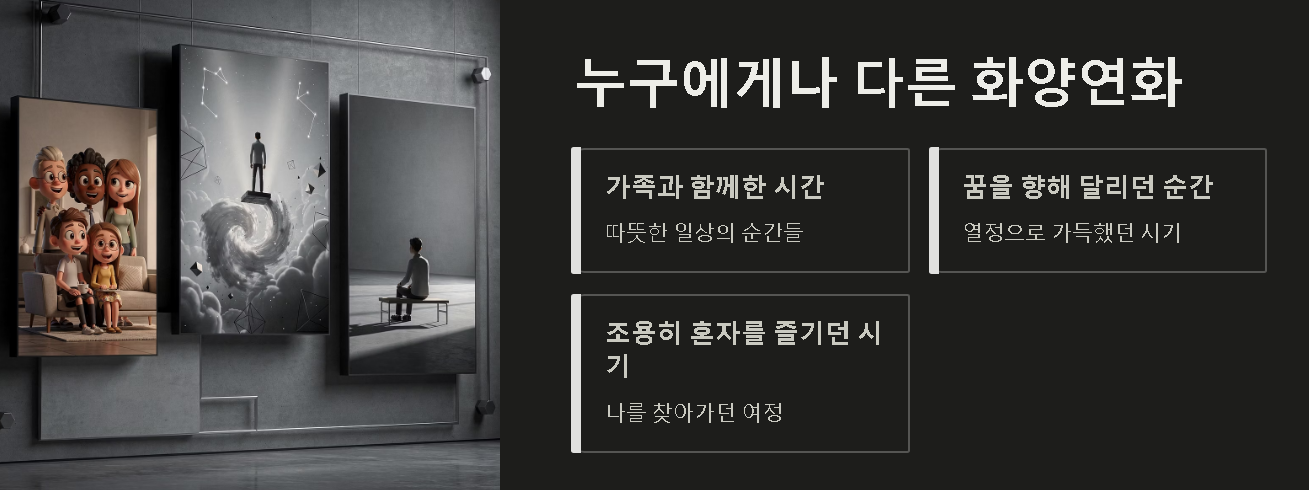 누군가에게는 가족과 함께한 시간일 수 있고, 또 다른 이에게는 꿈을 향해 달리던 순간, 혹은 조용히 혼자를 즐기던 시기일 수도 있습니다. 결국 화양연화는 ‘가장 나다운 순간’이며, 시간이 흐른 뒤 돌아보았을 때 가장 빛나는 기억으로 남는 시기입니다.