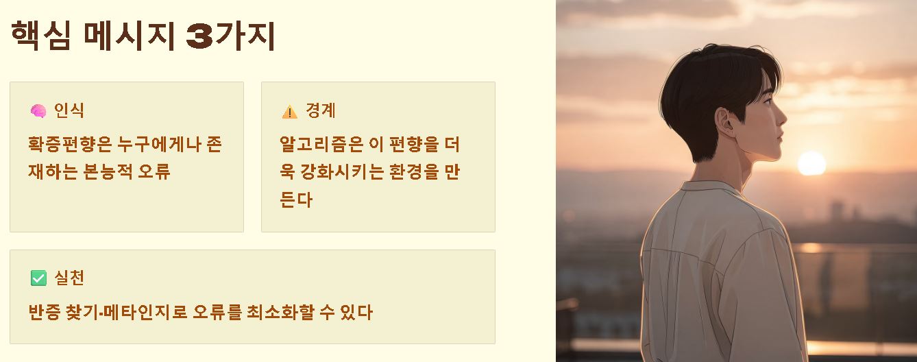 요약: 현대의 알고리즘 환경은 개인을 확증편향의 감옥에 가둬 균형 잡힌 시각을 갖기 어렵게 만듭니다.