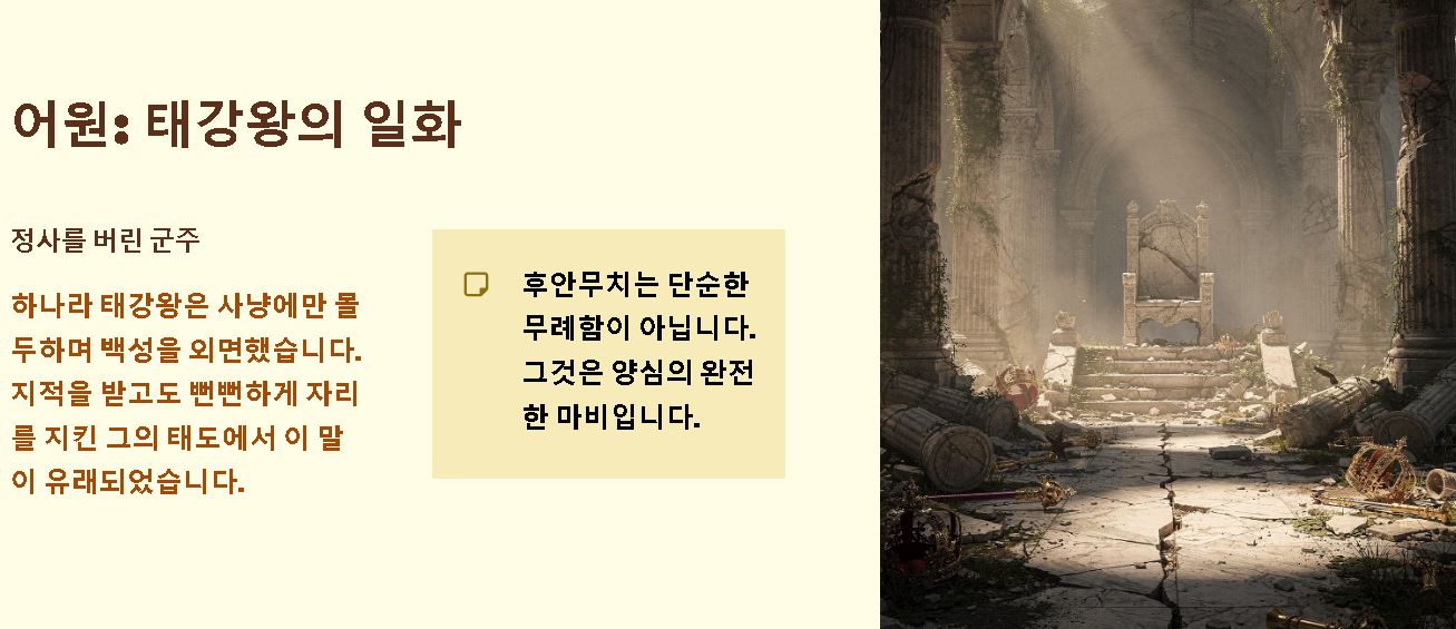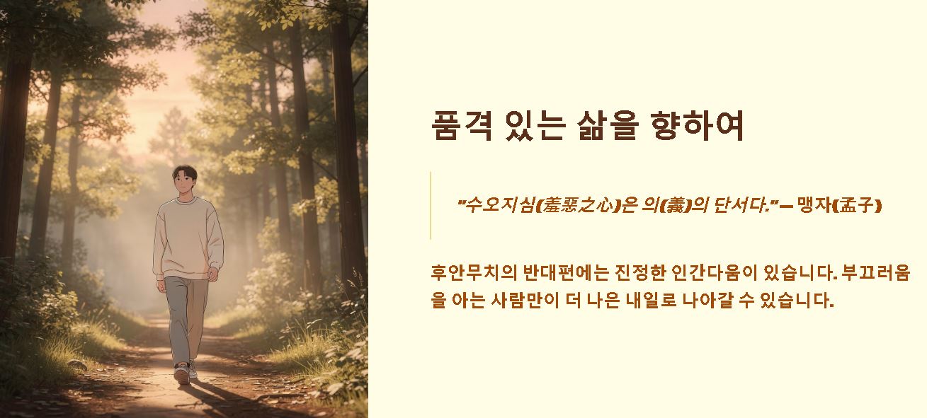 누구나 실수할 수 있지만, 그 이후의 태도가 그 사람의 그릇을 결정합니다. 부끄러움을 아는 마음은 고통스럽지만, 후안무치의 뜻과 반대되는 지점에서 우리를 더욱 인간답게 만드는 성장의 밑거름이 됩니다.