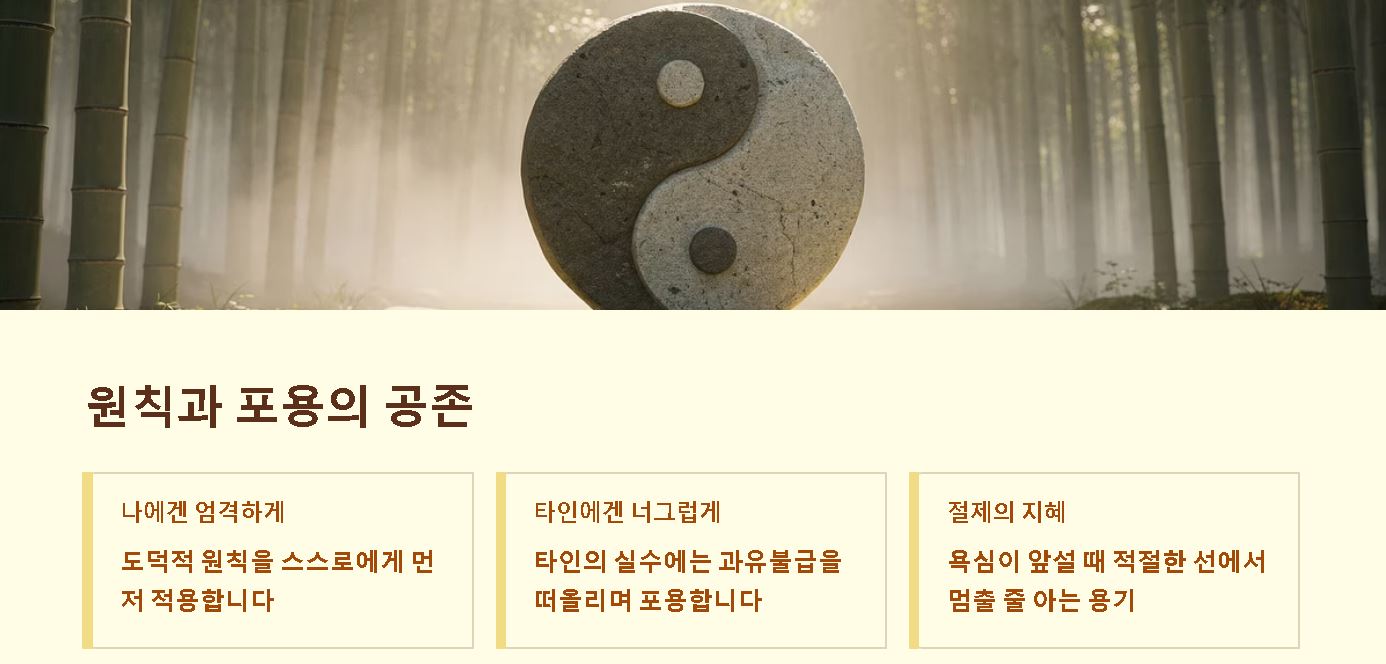 - 원칙과 유연함의 공존: 도덕적 원칙은 엄격하게 지키되, 타인의 실수에는 너그러운 포용력을 가집니다.