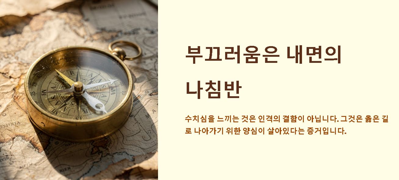 요약: 부끄러움을 느끼는 것은 인격의 결함이 아니라, 오히려 올바른 길로 나아가기 위한 내면의 정교한 나침반이 살아있음을 뜻합니다.