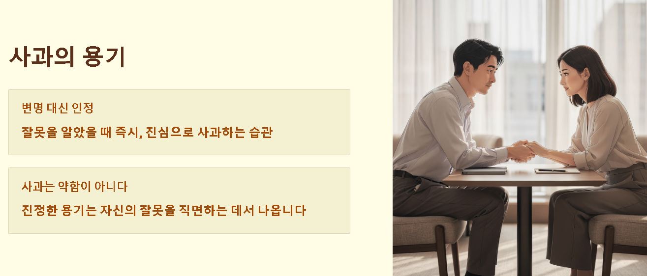 - 사과의 용기 기르기: 잘못을 인지했을 때 변명 대신 진심 어린 사과를 먼저 건네는 습관을 들입니다.
