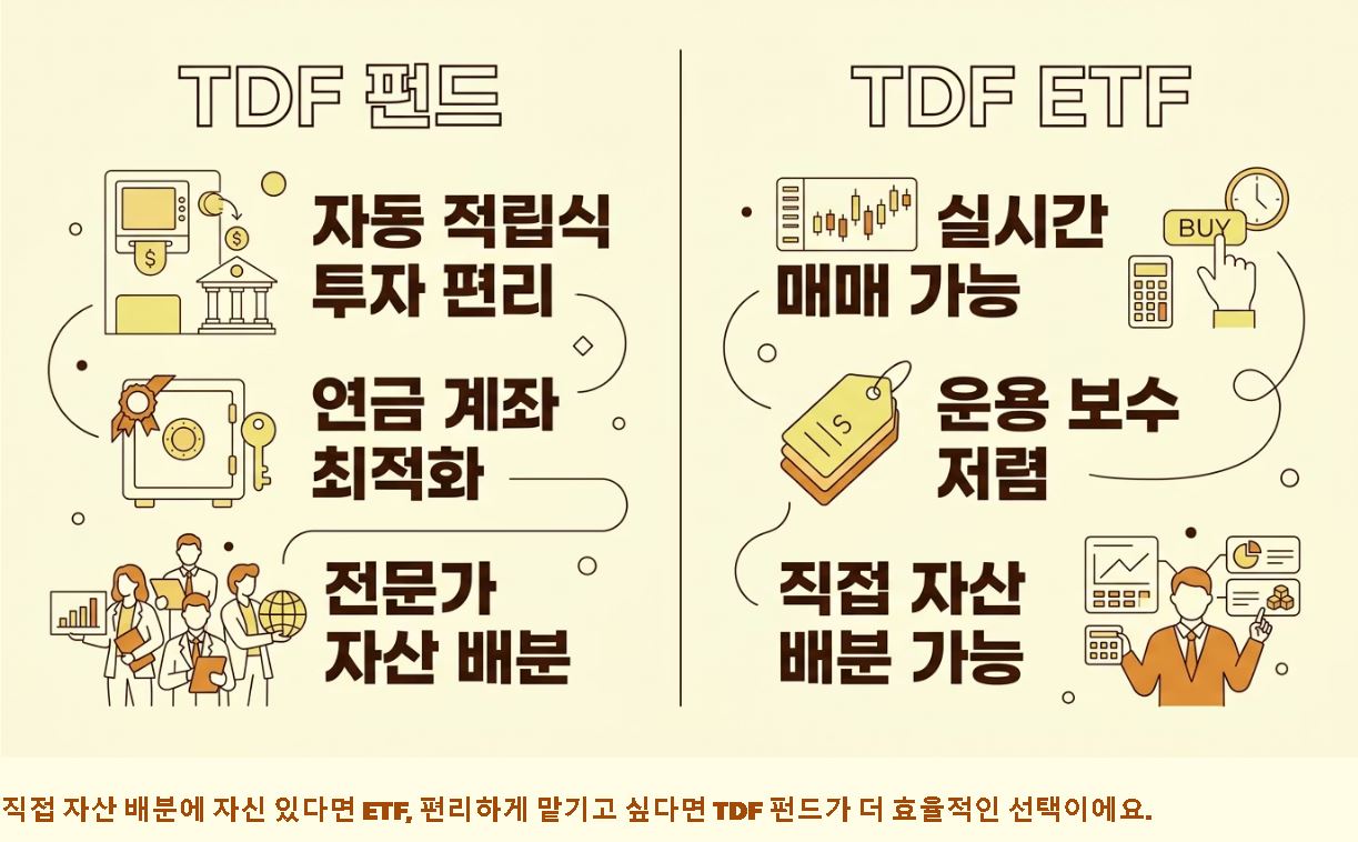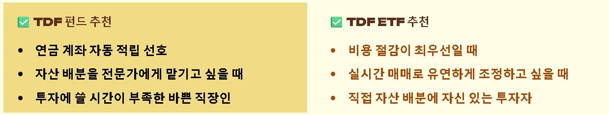- 운용 방식의 차이: 일반 TDF 펀드는 연금 계좌에서 자동 적립식 투자가 편하다는 장점이 있고, etf란 형태의 TDF는 실시간 매매가 가능하고 운용 보수가 상대적으로 저렴하다는 특징이 있어요.