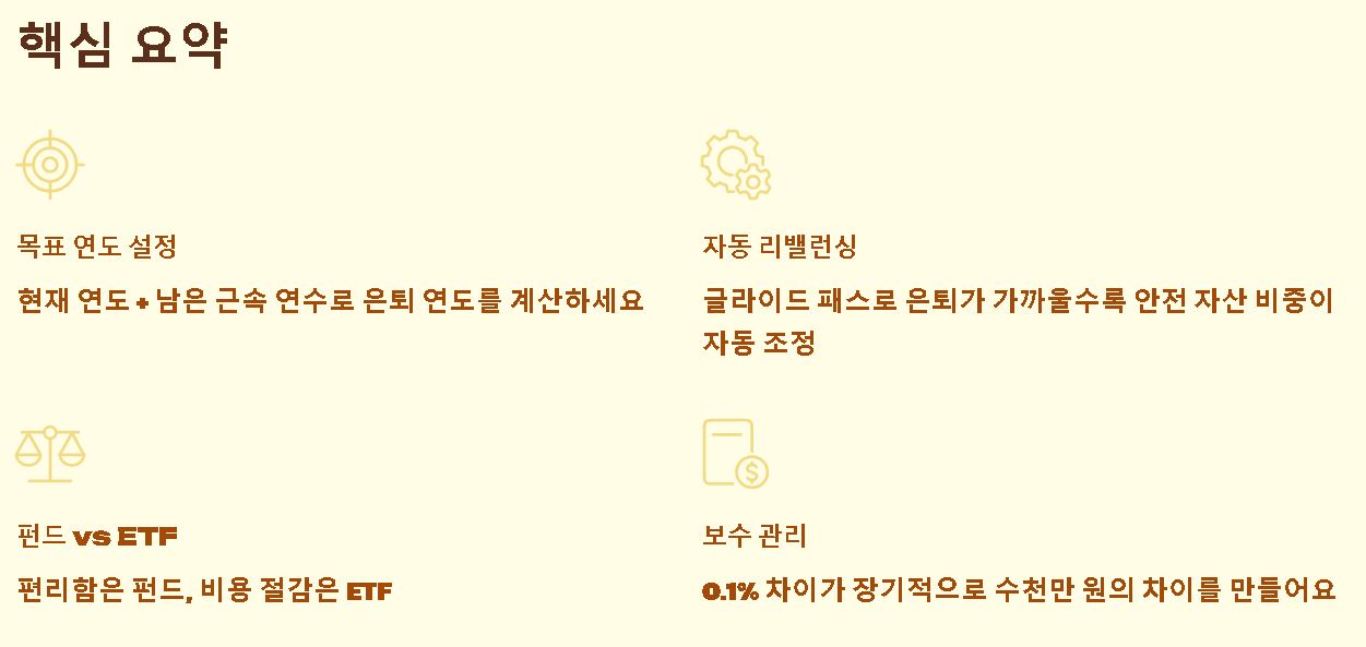- 글라이드 패스(Glide Path): 비행기가 착륙할 때 서서히 고도를 낮추듯, 은퇴 시점이 다가올수록 주식 같은 위험 자산 비중은 줄이고 채권 같은 안전 자산 비중을 높이는 설계도를 말해요.
