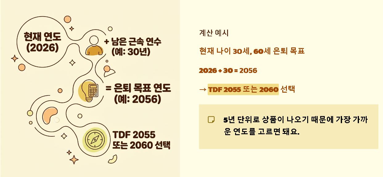 - 나이에 맞는 연도 선택: 보통 현재 연도에 본인의 남은 예상 근속 연수를 더해서 결정해요. 예를 들어 지금 30세이고 60세 은퇴가 목표라면 2026+30=2056에 가까운 TDF 2055나 2060 상품이 적정 기준이 돼요.