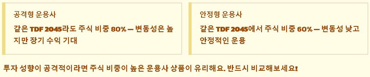 - 운용사별 전략 차이: 같은 2045 상품이라도 어떤 운용사는 주식 비중을 80%로 높게 가져가고, 어떤 곳은 60%로 낮게 가져가기도 해요. 본인이 조금 더 공격적인 성향이라면 주식 비중이 더 높은 운용사의 상품을 고르는 게 유리해요.