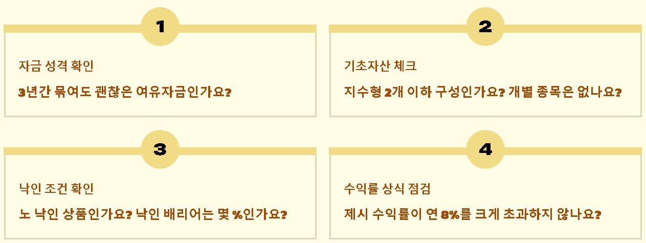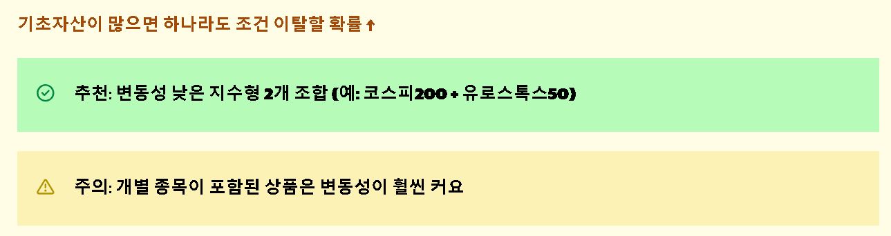 - 기초자산의 개수 확인: 기초자산이 많을수록 하나라도 조건을 이탈할 확률이 높아져요. 가능하면 변동성이 적은 지수형 2개 정도로 구성된 상품이 유리해요.