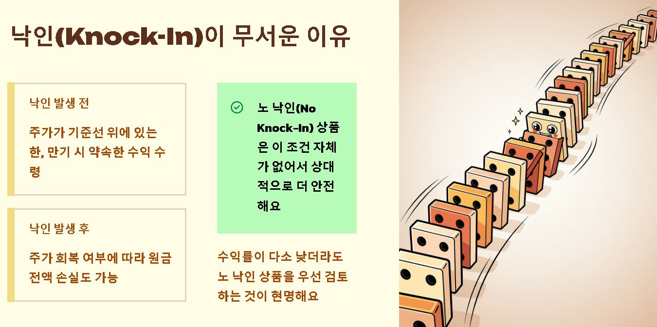 - 낙인(Knock-In): 주가가 만기 전 한 번이라도 설정된 하한선(보통 50% 미만) 밑으로 떨어지는 것을 말해요. 낙인이 발생하면 원금 손실 가능성이 매우 커지기 때문에 '노 낙인(No Knock-In)' 상품이 상대적으로 안전해요.