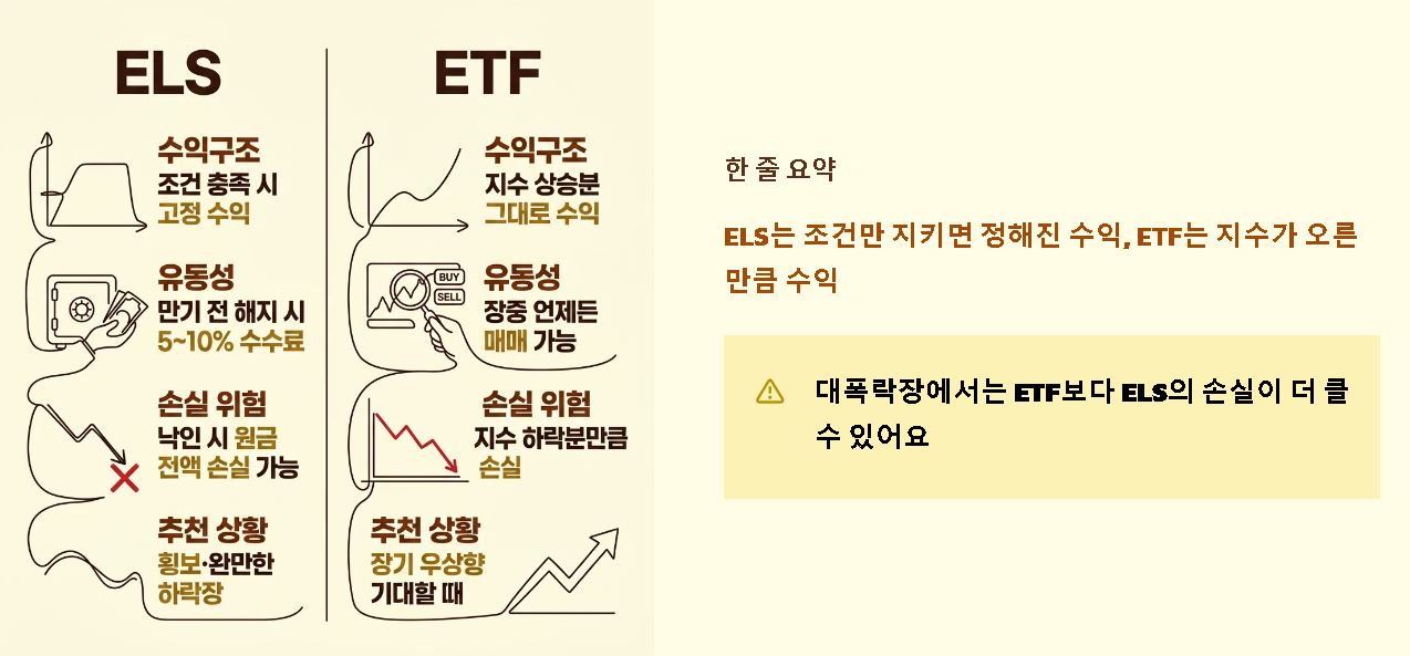 - 손실 폭의 차이: 지수가 완만하게 하락할 때는 ELS가 유리할 수 있지만, 특정 선을 넘는 대폭락장에서는 ELS가 ETF보다 훨씬 큰 손실(원금 전액 가능)을 입을 수도 있어요.