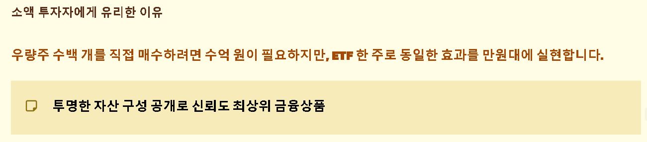 - 소액 투자 가능: 우량주 수백 개를 직접 사려면 막대한 자금이 필요하지만, ETF는 만원 단위로도 시장 우량주 전체에 투자할 수 있습니다.