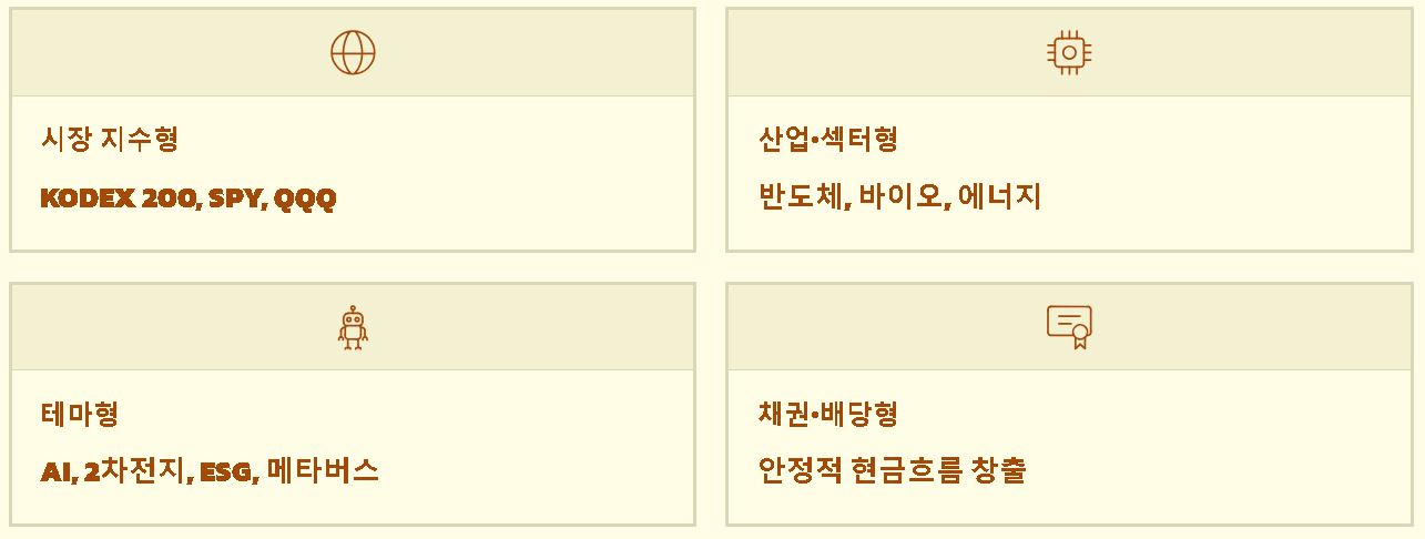 요약: 본인의 투자 철학에 맞춰 안정적인 지수 추종부터 역동적인 산업 테마까지 폭넓은 선택이 가능합니다.